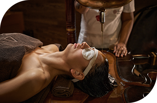 A fine stream of medicated herbal oil is poured into this area to energize it and release the mind from accumulated tension.